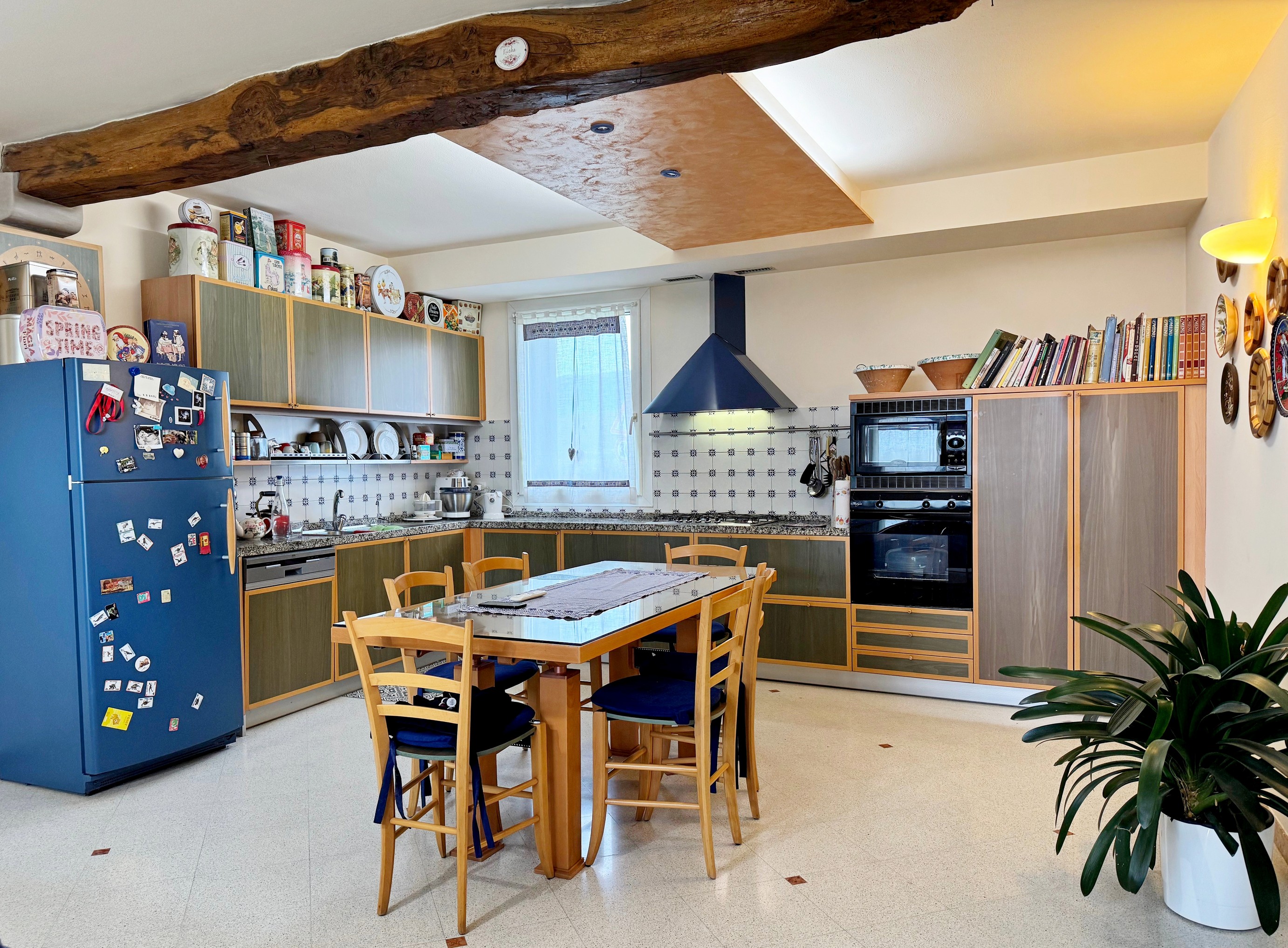 La taverna unisce il corpo principale alla dependance e fornisce uno spazio molto utile: gode di una seconda cucina con forno a legna da incasso e camino in marmo, e di ampie vetrate scorrevoli che la collegano al portico esterno e al giardino.