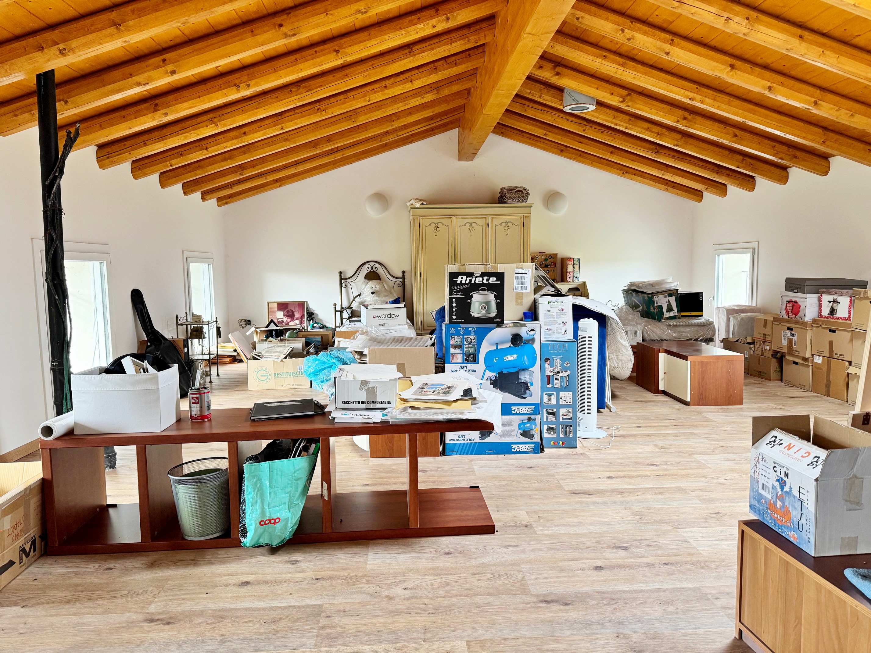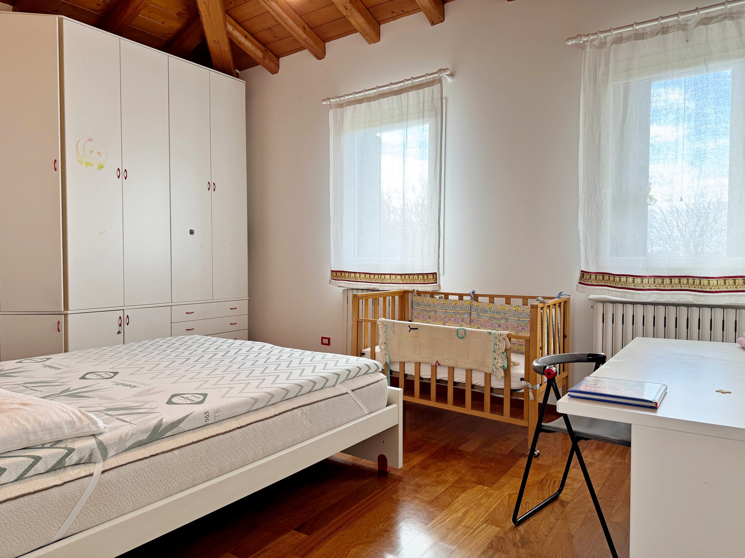 La dependance offre versatilità su due livelli: al pian terreno una stanza libera polifunzionale con accesso al box doppio e alla cantina, al primo piano un sala luminosa con travi a vista, perfetta per uno studio professionale o come suite per gli ospiti.