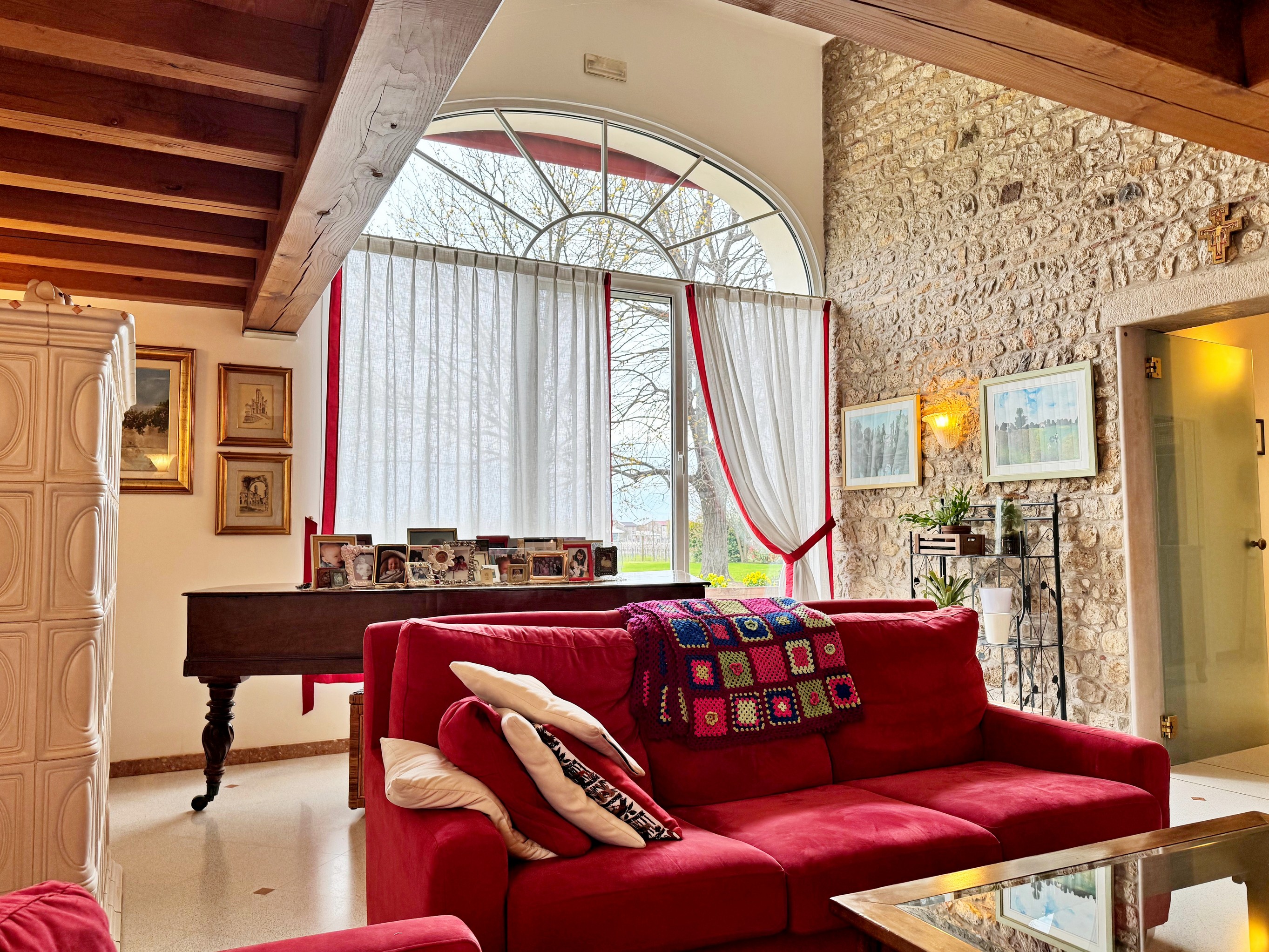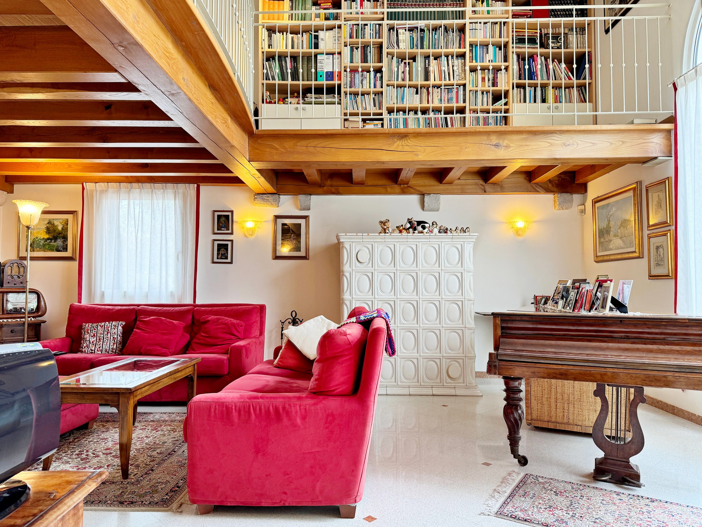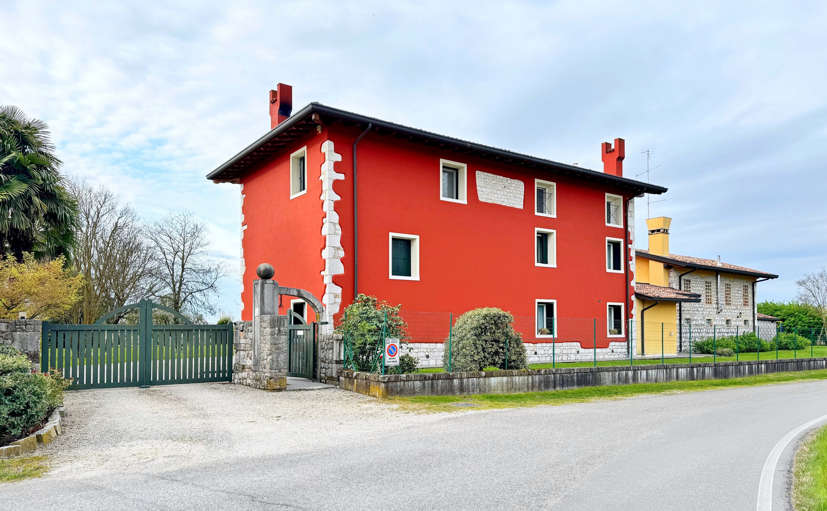 Il corpo principale si distingue per l'elegante facciata, impreziosita da ampie vetrate ad arco. Si sviluppa su tre livelli: al pian terreno ingresso, ampio salone soppalcato con stube, travi a vista e muro in pietra, cucina abitabile, pranzo, ripostiglio, bagno e c. t. /lavanderia; al primo piano disimpegno, ampia camera padronale con cabina armadio, bagno en suite e terrazzo privato, camera singola e bagno; al secondo piano due camere da letto e accesso all'ampia soffitta abitabile.