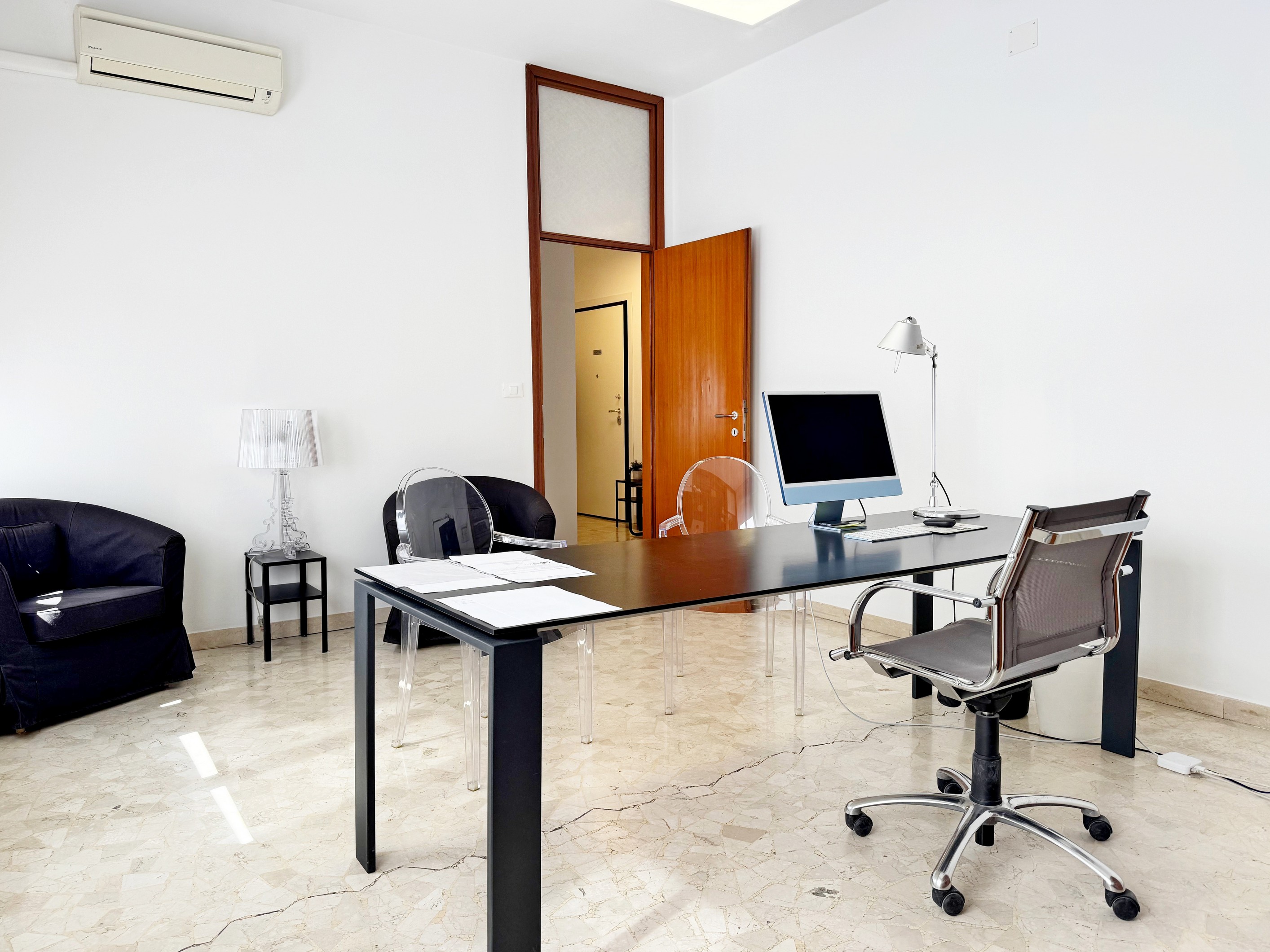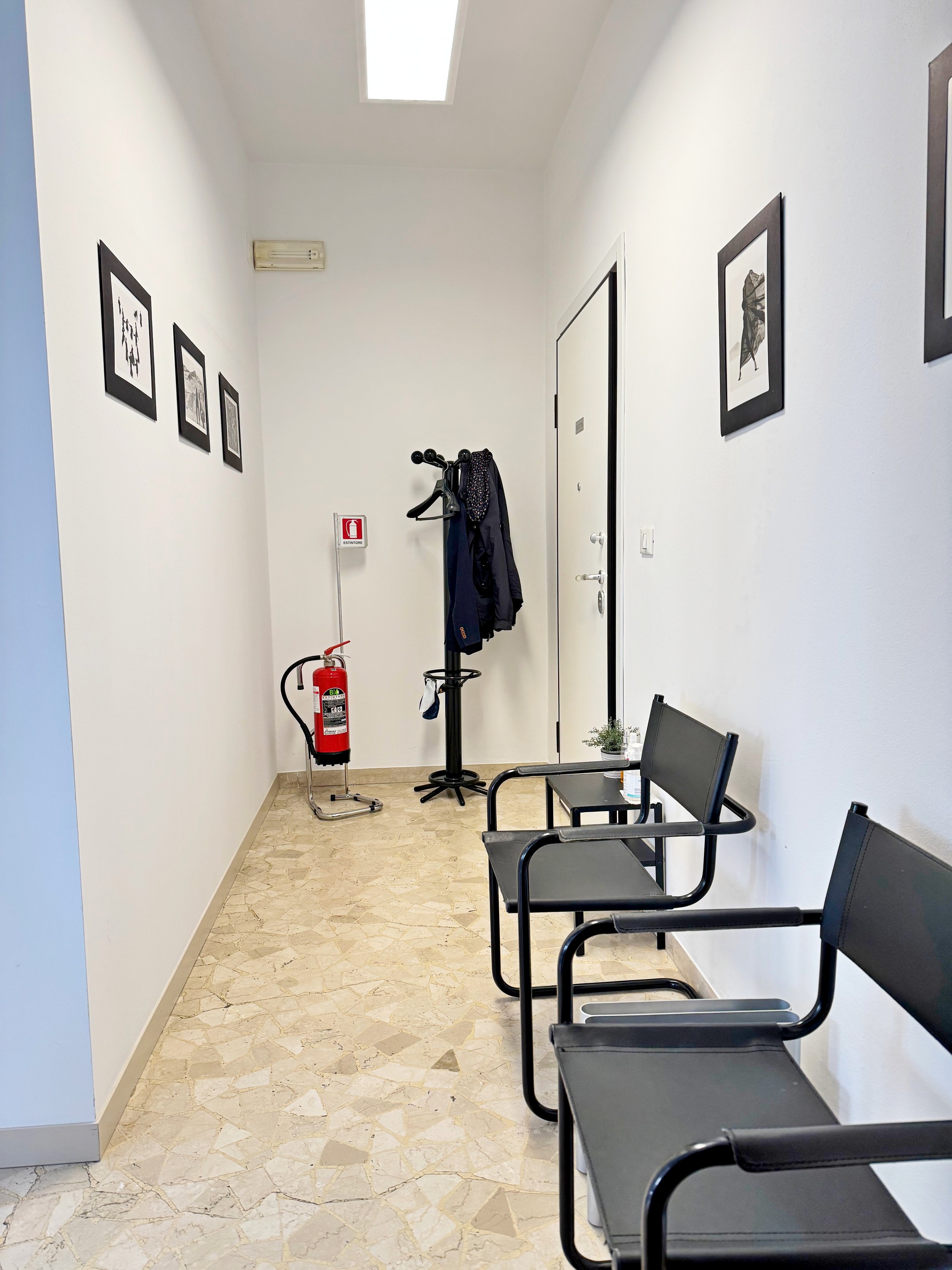 Sala d'attesa, tre postazioni separate, archivio e un bagno.
